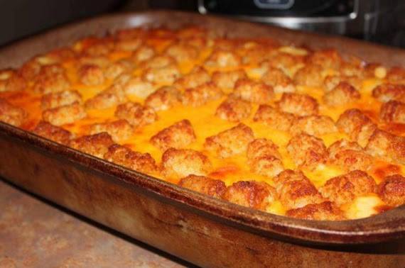 Preheat Oven For 350 degrees. Grease 13×9 inch pan. Layer the beef on the bottom of the pan, set aside. In a med mixing bowl add sour cream and mushroom soup and mix well. Then layer the mixture on top of the beef, then add cheese. Top with tatter tots. Bake covered for 45 minutes. Uncover and bake 15 minutes longer, adding extra cheese here if desired. Once cheese is melted you will have One fabulous meal Everyone will enjoy!