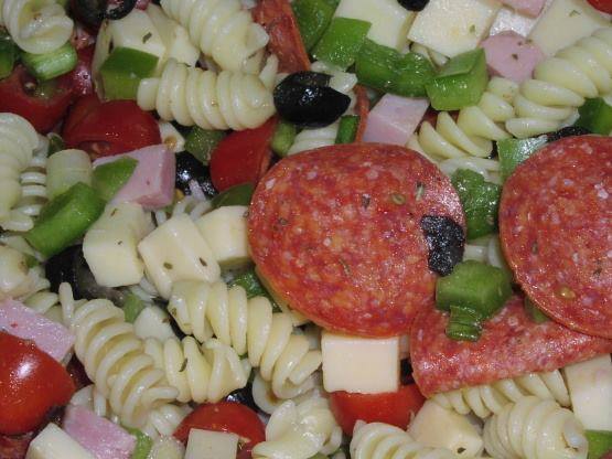 Kids love this salad. Makes a nice, cool summer lunch. You can leave out the olives and peppers if desired.”
