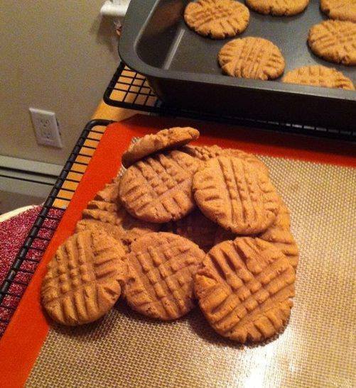 Preheat oven to 375?. Mix first six ingredients. Add the rest of the ingredients. Mix well. Roll into balls and press down with a fork dipped in sugar or flour. Bake for 10-12 minutes on ungreased cookie sheet.